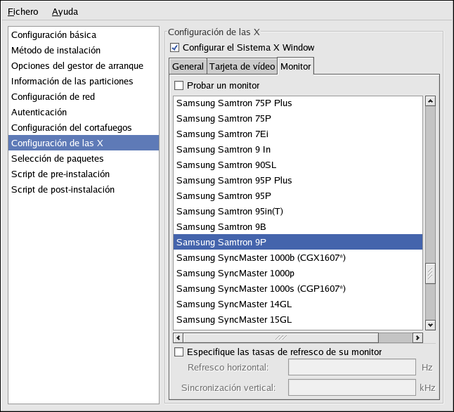 Alternativamente puede seleccionar su monitor desde la lista. También puede especificar los rangos de sincronización horizontal y vertical en vez de especificar un monitor al pulsar la opción Especifique hysnc y vsync en vez de monitor. Esta opción es útil si el monitor para el sistema no aparece listado. Observe que cuando esta opción está activada, la lista de monitores está desactivada.