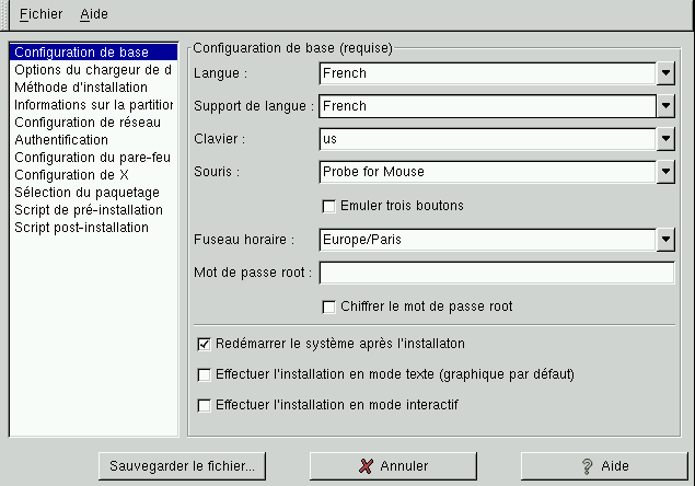Configuration de Kickstart vous permet de créer un fichier kickstart à l'aide d'une interface utilisateur graphique, afin que vous n'ayez pas à vous rappeler la syntaxe correcte du fichier.