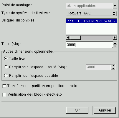 Répétez ces étapes pour toutes les partitions que vous devrez créer pour l'installation de RAID. Notez qu'il n'est pas nécessaire que toutes les partitions soient des partitions RAID. Par exemple, vous pouvez ne configurer que /home comme périphérique RAID logiciel.