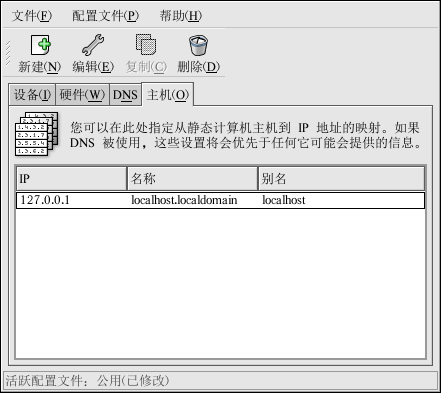 「主机」标签允许你从 /etc/hosts 文件中添加、编辑、或删除主机。该文件包含 IP 地址和它们相对应的主机名。