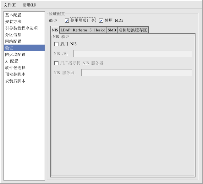 在「验证」部分,选择用户口令是否使用屏蔽和 MD5 加密。推荐你使用这些选项,它们被默认选择。