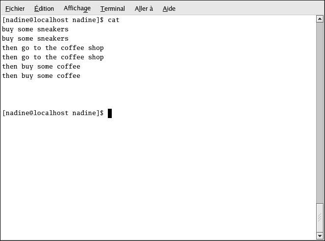 Par exemple, l'utilisation de la commande cat seule dirige simplement votre entrée vers l'écran comme si elle répétait la ligne que vous venez de taper. Dans l'exemple suivant, la commande cat répète toutes les lignes saisies: