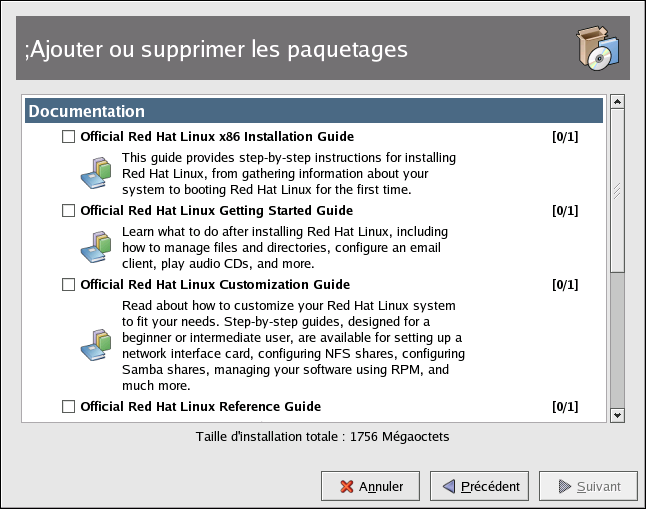 Si vous avez un produit sous emballage Red Hat Linux, jetez un coup d'oeil au CD-ROM de documentation de Red Hat Linux. Tous les manuels de Red Hat Linux sont contenus dans le CD-ROM. Vous pouvez également télécharger séparément notre documentation au format HTML, RPM, PDF et compressé tarball (.tar.gz) à l'adresse suivante: http://www.redhat.com/docs/. Une fois connecté sur votre compte utilisateur, introduisez le CD-ROM de documentation dans le lecteur de CD-ROM. L'application Outil de gestion de paquetages sera automatiquement lancée pour vous permettre d'installer la documentation de Red Hat Linux. Suivez les instructions et choisissez la documentation que vous souhaitez installer.