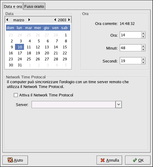 Il demone Network Time Protocol (NTP)sincronizza l'orologio del sistema con un server time remoto o una sorgente time (come ad esempio un satellite). L'applicazione vi permette di configurare un demone NTP per sincronizzare il vostro orologio del sistema con un server remoto. Per abilitare questo contenuto, fare clic sul pulsante Abilitare il Network Time Protocol. Questo abiliterá il menú a tendina del Server. Potete scegliere uno dei server predefiniti oppure un tipo di nome del server nel menu a tendina. Il vostro sistema non inizierá la sincronizzazione con il server NTP, fino a quando non fate clic sul pulsante OK, in questo caso la configurazione sará salvata e il demone NTP verrá avviato (oppure riavviato se é stato giá eseguito). Se desiderate che il demone inizi automaticamente al momento dell'avvio, dovete eseguire il comando /sbin/chkconfig--level 345 ntpd on per abilitare ntpd per i runlevel 3,4 e 5.