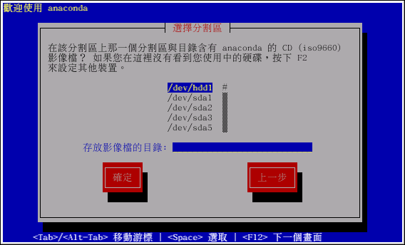 請輸入含有 Red Hat ISO 影像檔的分割區所在的裝置名稱。 其中有一個欄位標示為『存放影像檔的目錄』。 假如 ISO 影像檔並不在該分割區的根目錄, 請輸入 ISO 影像檔所在的路徑(例如,假如 ISO 影像檔是在 /test/new,您可以輸入 /test/new)。